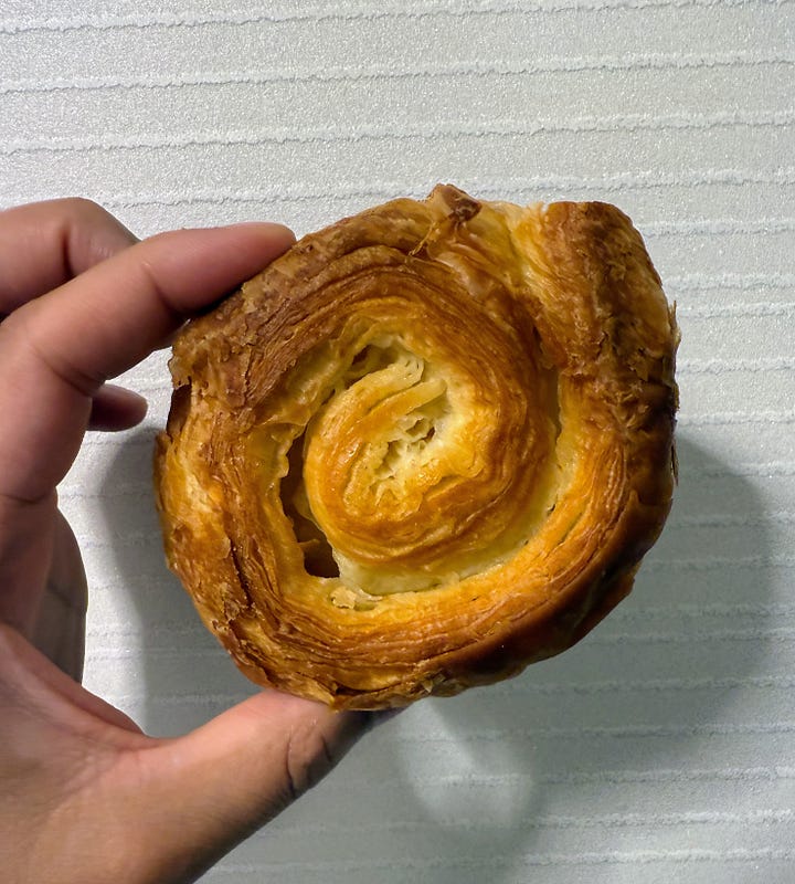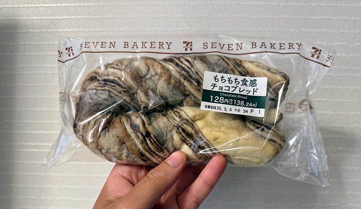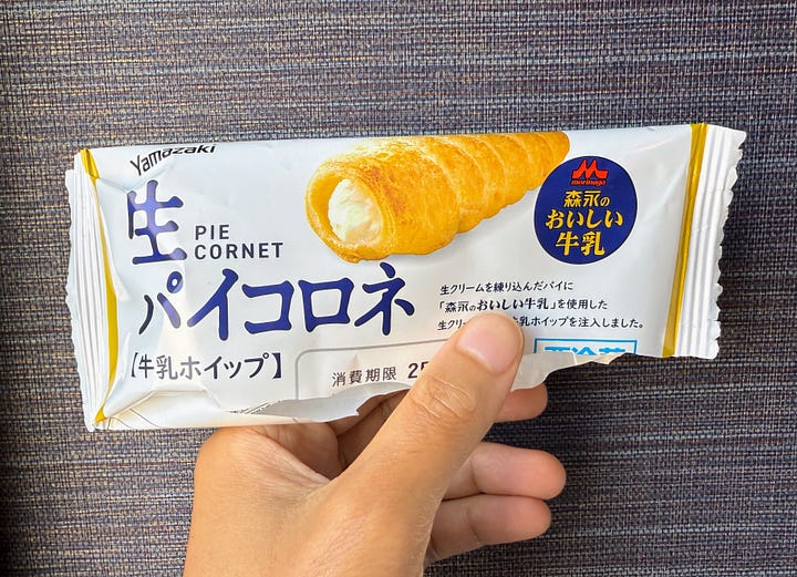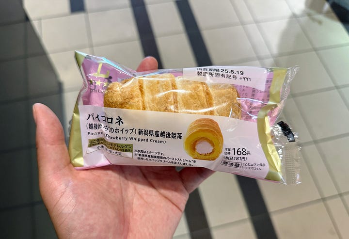 Some very serviceable pastry. This kouign amann was a better effort than many I’ve had from bakeries recently… not to be shady, it’s a hard thing to perfect! I will say, there is an undertone of what I can only describe as ‘butter flavoring’ in a lot of these. This sounds disgusting but actually works well in this context for whatever reason. It’s worth noting: most of these pastries had expiry dates no more than 48 hours way, tops, so these are not your typical shelf stable Twinkie adjacent treats. I had read about2 this chocolate bread and was profoundly disappointed… like, did I miss reheating instructions somewhere? This Lawson strawberry whipped cream pie cornet evoked strawberry pop tart in a major way.